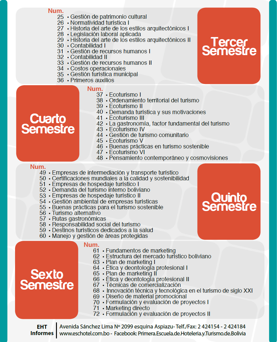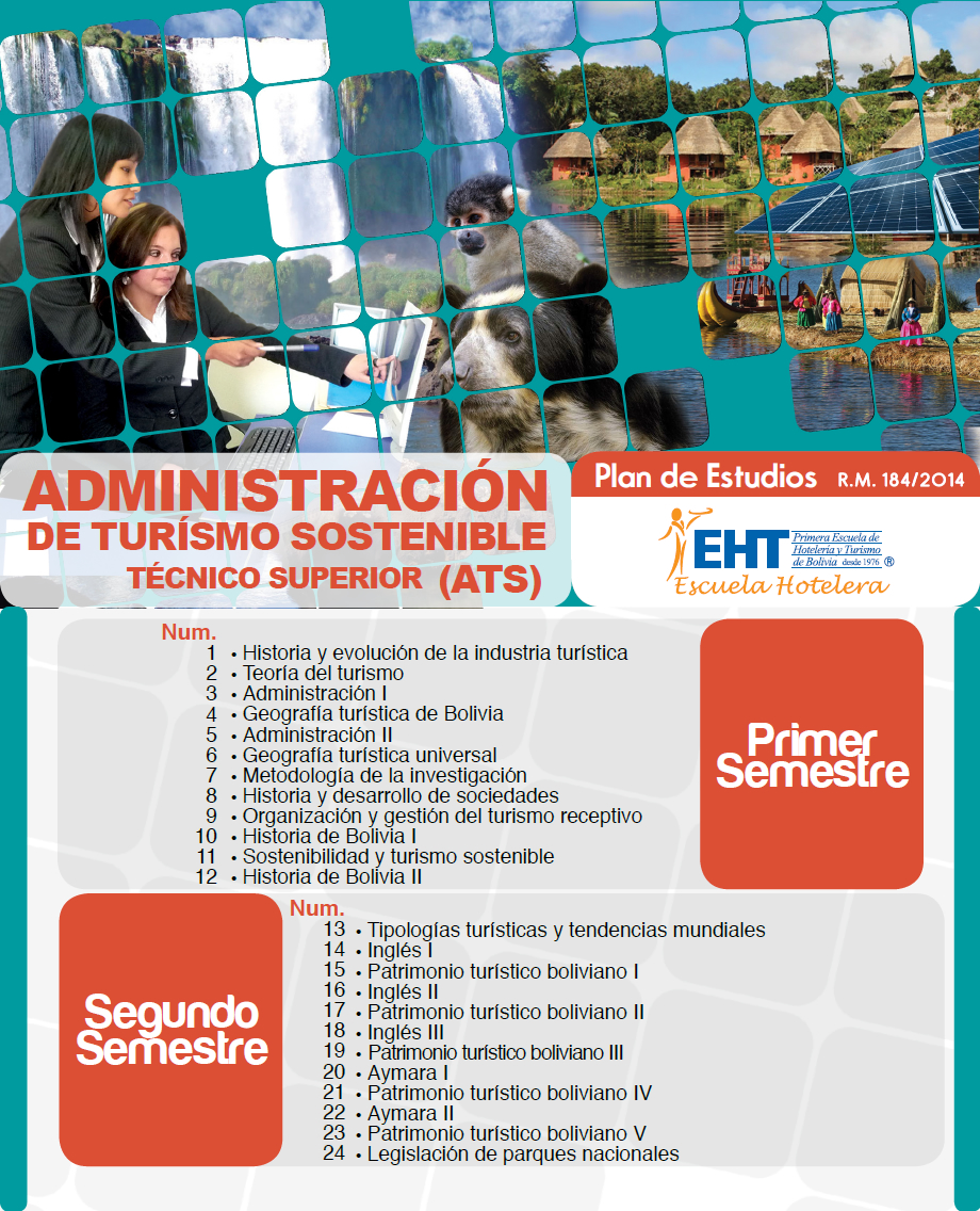 La carrera de Administración del Turismo Sosteniblede la Primera Escuela de Hotelería y Turismo de Bolivia,contribuye a promover el desarrollo turístico sostenible de forma eficiente, preparando profesionales con sólidas bases académicas y de investigación, fundamentadas en la conservación, gestión empresarial, y uso responsable del patrimonio. El programa en Administración del Turismo Sostenible, es pionero a nivel nacional en el tema de turismo sostenible.La gran diversidad biológica y cultural de Bolivia, la calidad de sus recursos naturales y su riquísima cultura y tradiciones, hacen del país un atractivo destino turístico, único en el mundo.